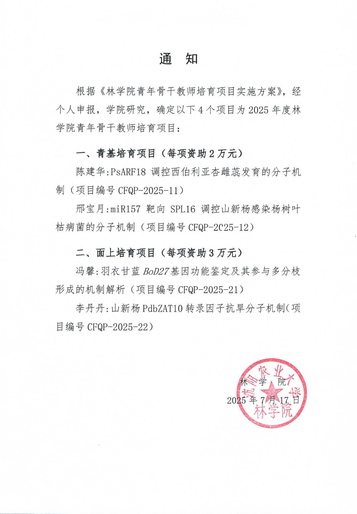 林学院2025年度国家自然基金培育项目资助名单