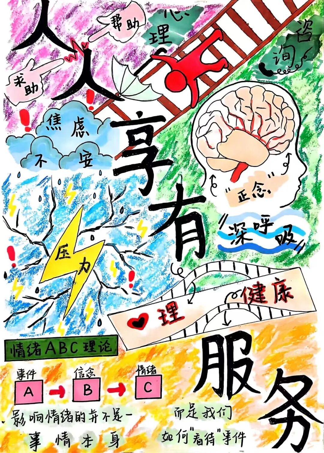 世界精神卫生日之际,林学院学子以笔为窗,绘出对心灵健康的关注。大赛期间,同学们用创意记录对“人人享有心理健康服务”的理解,每一幅海报,都是对心灵守护的热忱奔赴;每一抹色彩,都藏着传递心理能量的真挚期许。