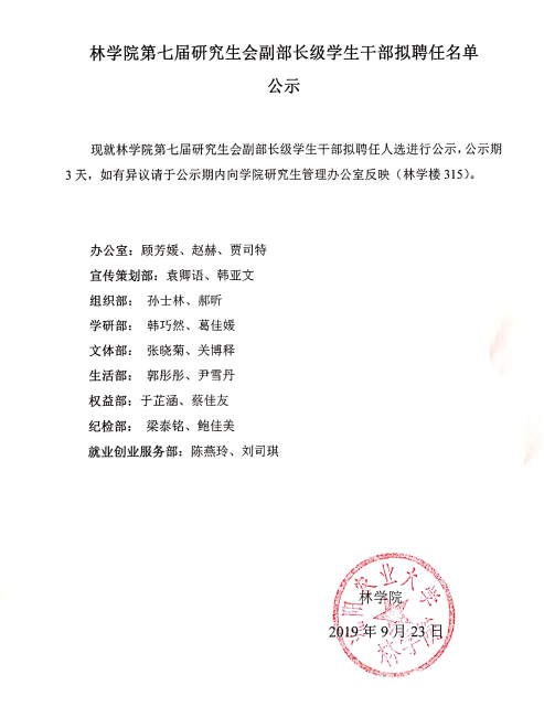 林学院第七届研究生会副部长级学生干部拟聘任名单